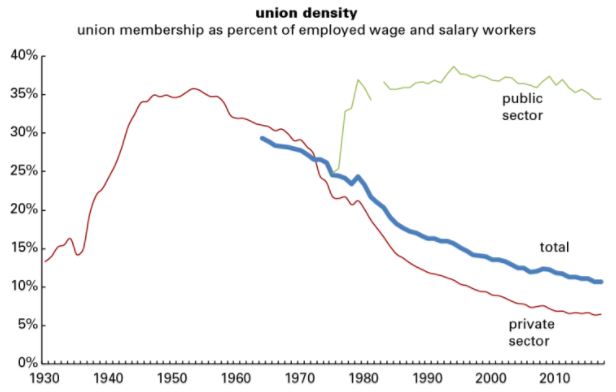 Declining union density is bad for at least two reasons: it’s bad for working-class power and for living standards. Yes, most unions are weak subordinates of the Democratic Party establishment, serving as little more than ATMs and get-out-the-vote operations for boring candidates who do little for their labor supporters once elected. But they do serve as a brake on the political class’s most barbaric instincts, which is why politicians like Scott Walker and moneybags like the Koch brothers (who funded Walker’s anti-union drive in Wisconsin) have it out for them.